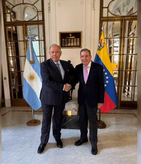 “El canciller Gerardo Werthein, acompañado por el embajador Wenceslao Bunge, recibió en la Embajada Argentina en Madrid al presidente electo de Venezuela, Edmundo González Urrutia”, publicó el Ministerio de Relaciones Exteriores en su cuenta de X. Según detallaron, el encuentro se desarrolló en un “marco de cercanía y espíritu de colaboración” y permitió abordar “una amplia agenda de temas relacionados a los desafíos que enfrenta la región”.