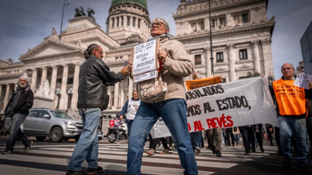 Los jubilados realizaron este miércoles una nueva protesta en las inmediaciones del Congreso para reclamar un aumento en los haberes y expresar su rechazo al veto presidencial a la ley que preveía una actualización de ingresos y la continuidad de la moratoria previsional.